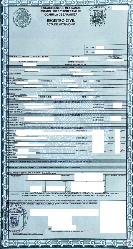 Acta de Matrimonio Coahuila de Zaragoza 2022