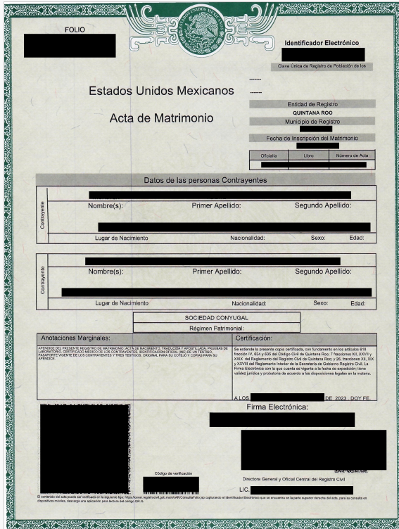 Digitale Eheurkunde aus dem Bundestaat Quintana Roo. Auch für andere Bundesstaaten verwendbar.