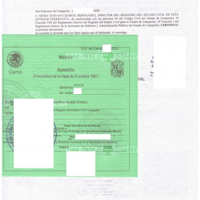 „Extracto/Acta de Nacimiento“, 3 Seiten, digitale Version, Campeche, Seite 2 Beglaubigung der Kopie, Seite 3 Apostille auf grünem Papier (siehe Galeriebild)