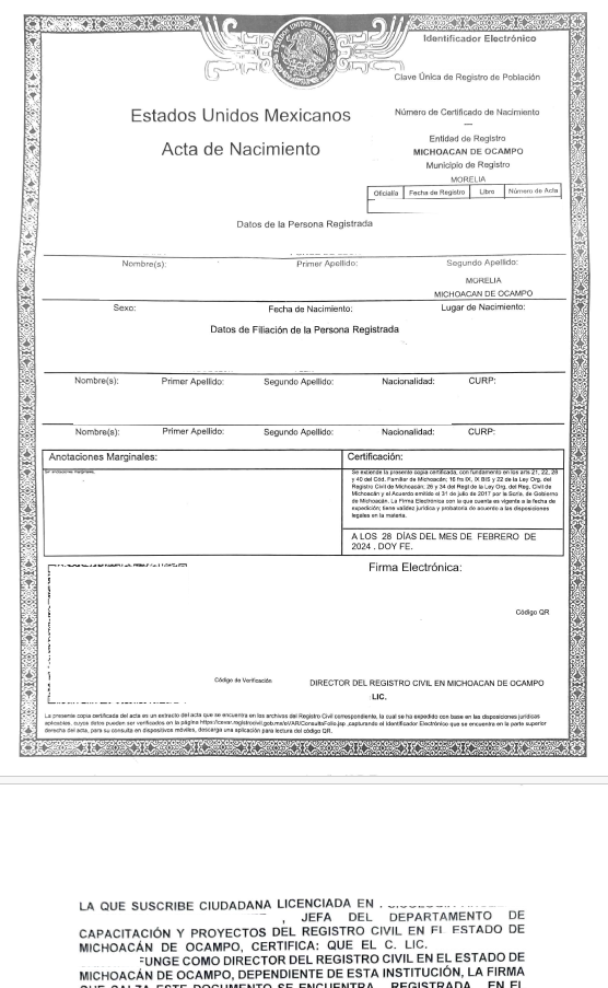 Diese Vorlage für die beglaubigte Übersetzung Spanisch > Deutsch einer mexikanischen Geburtsurkunde ist eine Urkunde (Acta de nacimiento / Extracto de nacimiento, siehe Produktbild) des Bundesstaates Michoacán mit Legalisation und Apostille. Erkennungsmerkmale: Artikeln 21, 22, 28 und 40 des Familiengesetzbuchs von Michoacán; Artikel 16 Abschnitte IX, IX BIS und 22 des Organgesetzes des Personenstandsregisters von Michoacán, 26 und 34 der Verordnung über das Organgesetz über die Personenstandsregister von Michoacán und Beschluss des regionalen Regierungsministeriums von Michoacán vom 31. Juli 2017.