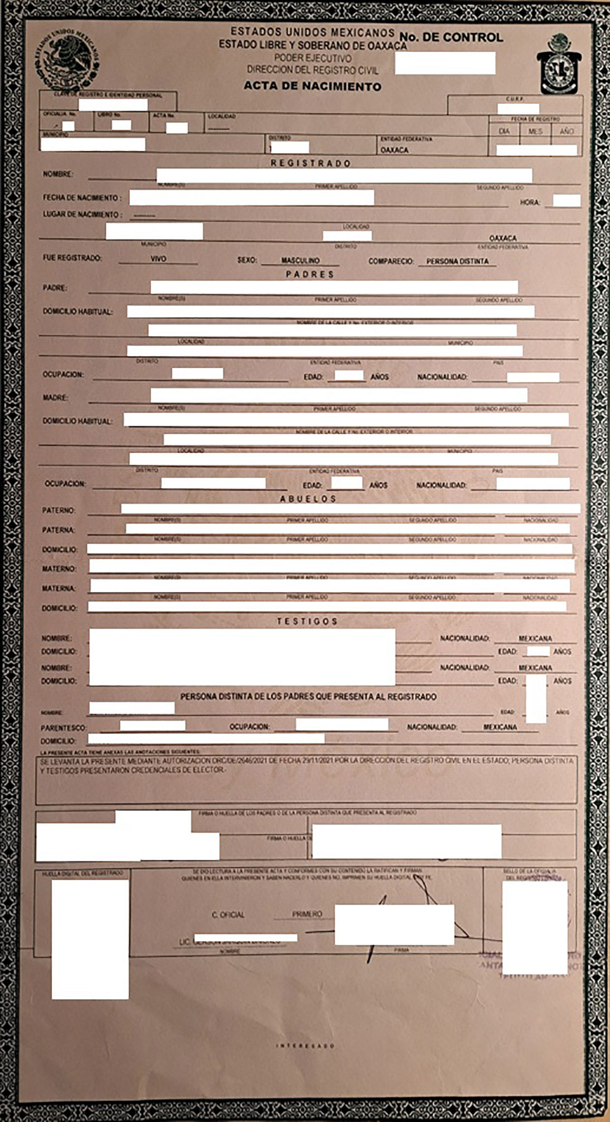 Acta de Nacimiento Mexiko Oaxaca tabellarisch Apostille