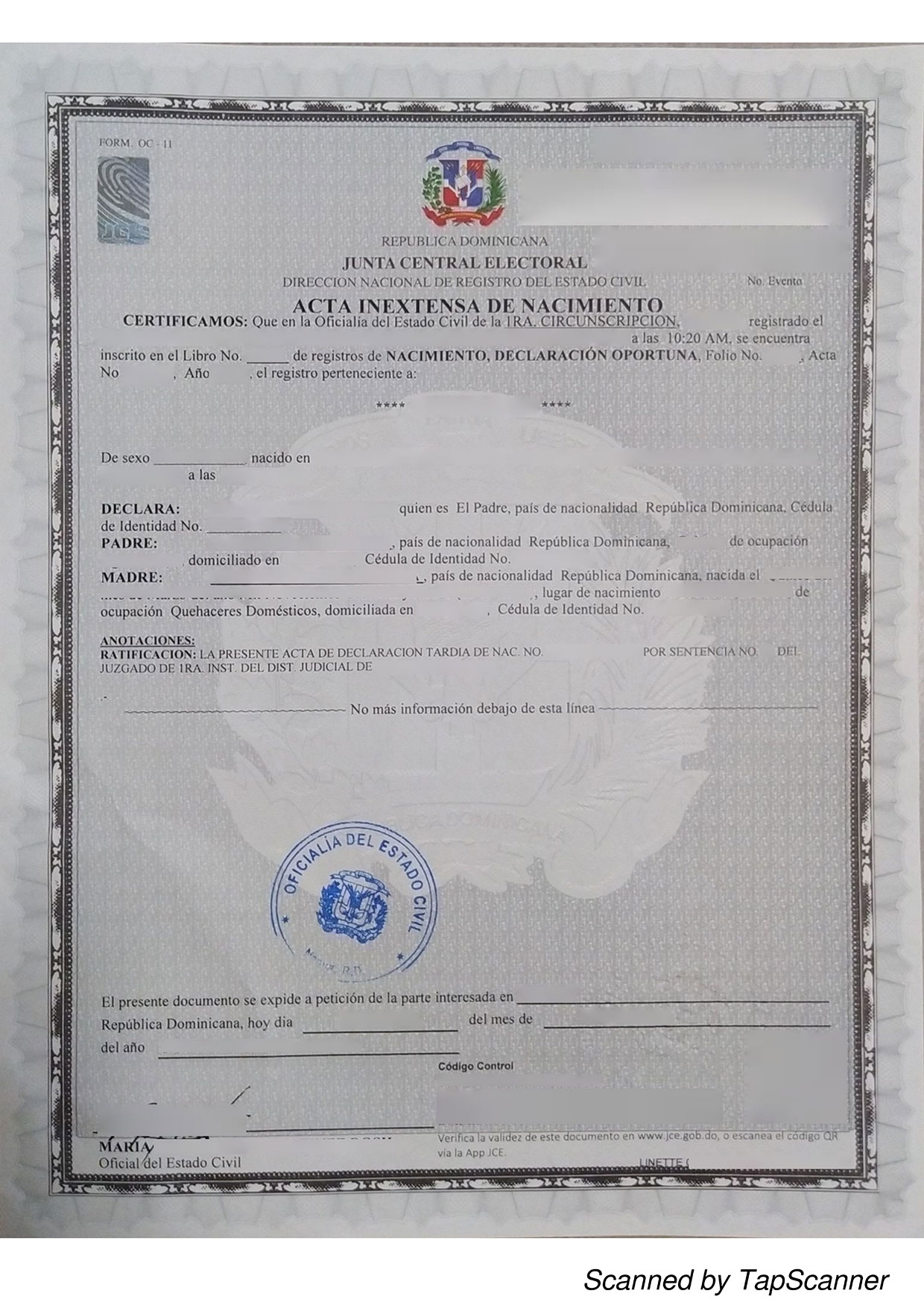 Acta inextensa de nacimiento República Dominicana mit Verwaltungsstempel