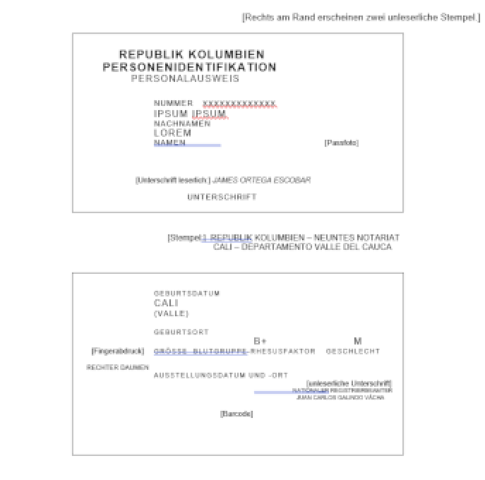 Vorlage für die beglaubigte Übersetzung ES>DE des kolumbianischen Personalausweises.