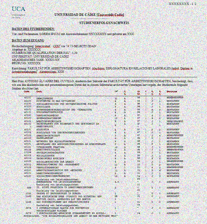 Vorlage für die beglaubigte Übersetzung ES<DE des Notenspiegels für den Studiengang Diplomatura Relaciones Laborales an der Universidad de Cádiz.
