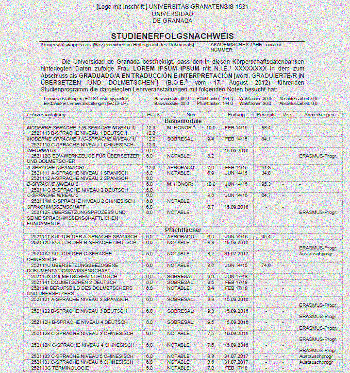 Vorlage für die beglaubigte Übersetzung ES<DE des Notenspiegels für den Studiengang Grado en Traducción e Interpretación, Universidad de Granada (UNIVERSITAS GRANATENSIS 1531).