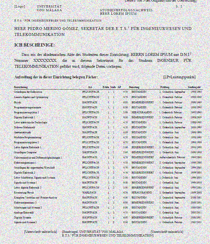 Vorlage für die beglaubigte Übersetzung ES<DE des Notenspiegels für den Studiengang Ingeniero de Telecomunicaciones an der Universidad de Málaga.