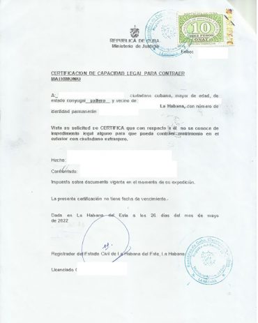 Certificación de matrimonio Cuba Registro del Estado Civil Cárdenas Matanzas