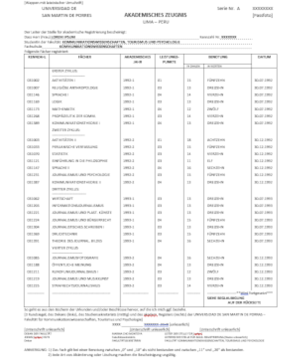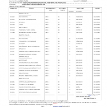 Vorlage für die beglaubigte Übersetzung ES<DE des Notenspiegels für den Studiengang Ciencias de Comunicación an der Facultad de Ciencias de la Comunicación, Turismo y Psicología der Universidad San Martín de Porrés in Peru.