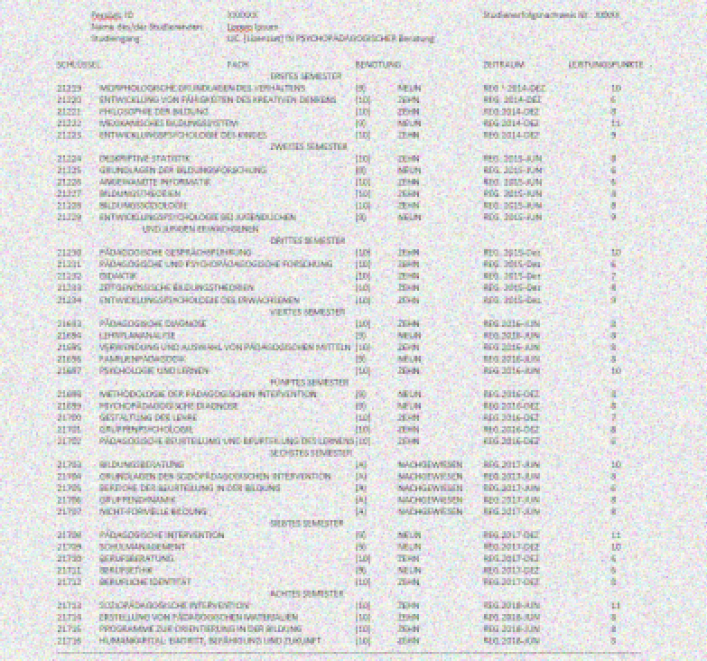 Vorlage für die beglaubigte Übersetzung ES<DE des Notenspiegels für den Studiengang Asesoría Psicopedagógica an der Universidad de Aguascalientes.
