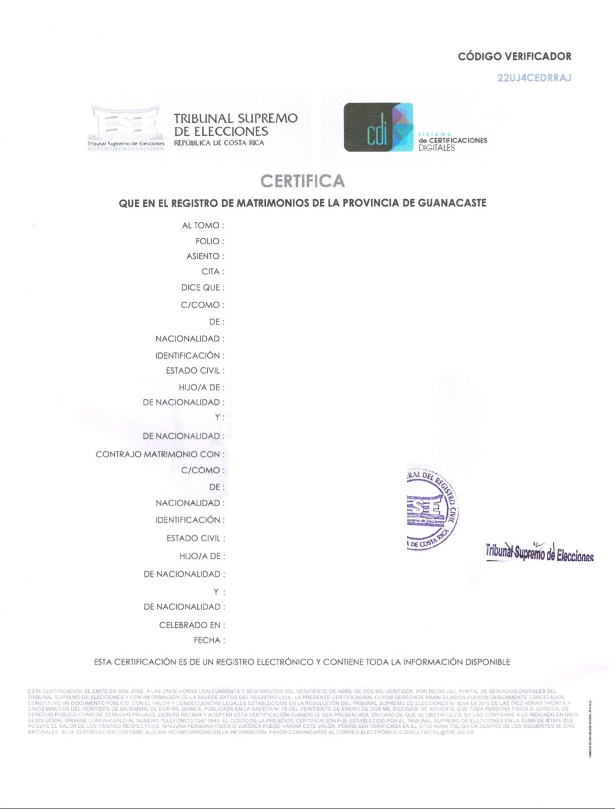 Certificado de Matrimonio Costa Rica, digitale Version des TSE, mit CDI Marke und Codigo Verificador, mit Apostille