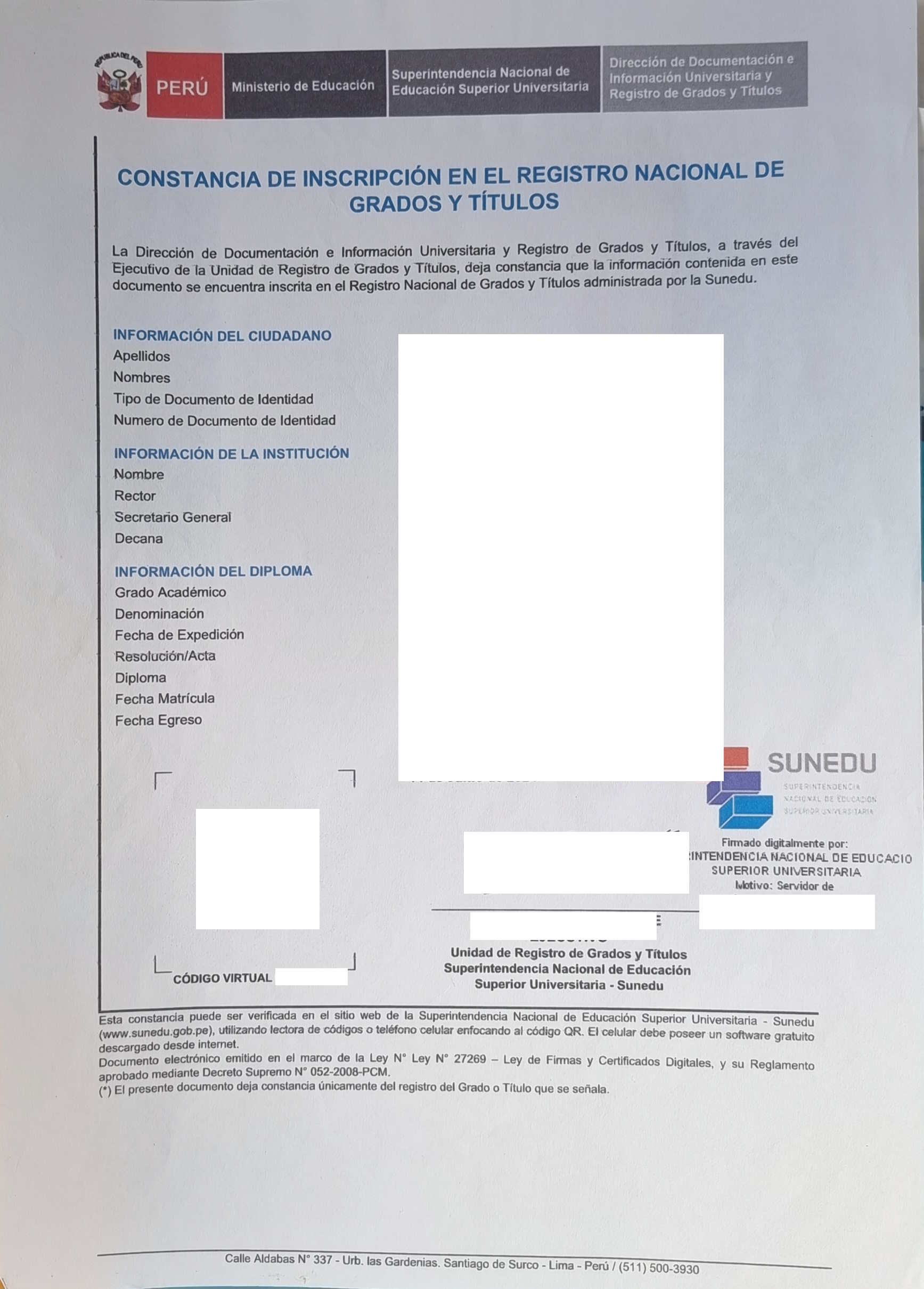 Constancia de inscripcion en el Registro Nacional de Grados y Títulos, SUNEDU, mit Apostille, ausgestellt im Jahr 2024 mit digitaler Signatur.