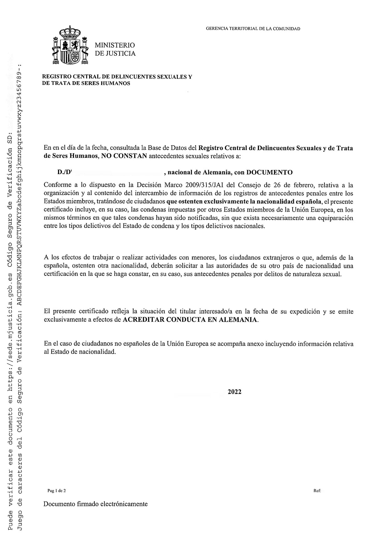 Führungszeugnis aus Spanien, ausgestellt vom Ministerio de Justicia, Registro Central de delincuentes sexuales y de trata de seres humanos , mit Zusatz: „En el caso de ciudadanos no españoles de la Unión Europea se acompaña anexo incluyendo información relativa al Estado de nacionalidad“ im Jahr 2022. „Informa:…“ für EU-Bürger. Tabellarische spanische Standard-Apostille mit Stempel des Ministerio de Justicia.