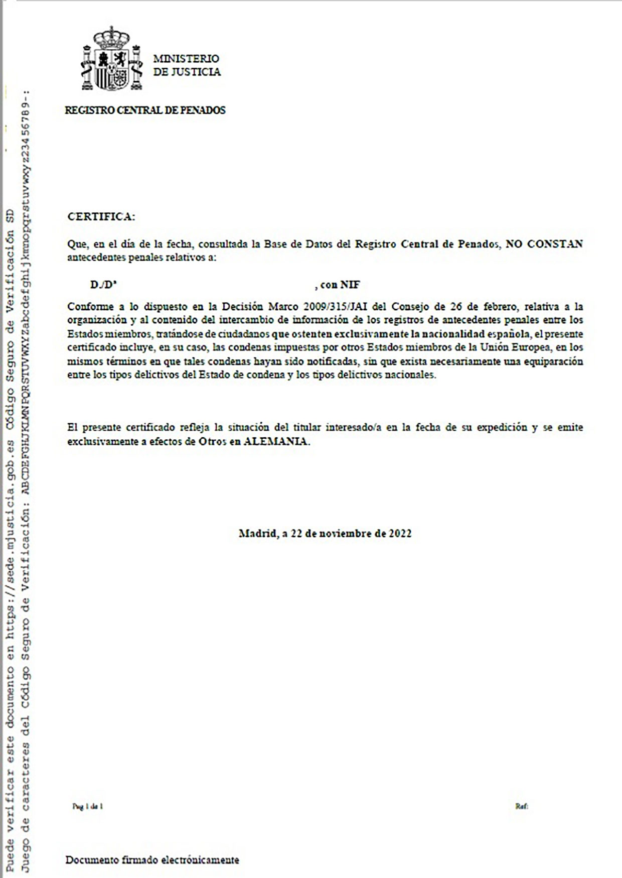 Führungszeugnis Spanien Registro Central de Penados nacionalidad española apostilliert