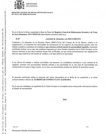 Vorlage für die beglaubigte Übersetzung eines Führungszeugnisses aus Spanien für spanische Staatsbürger, mit Apostille