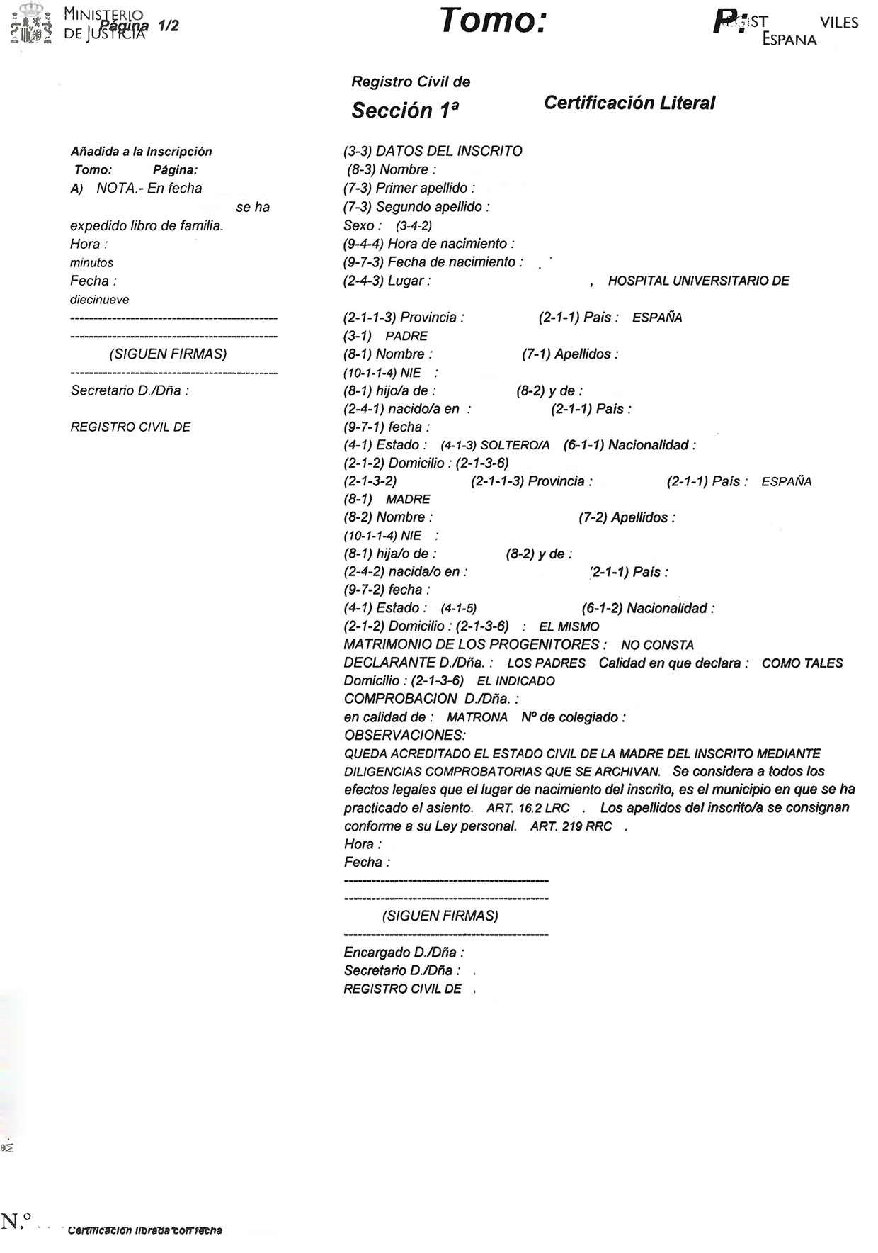 Geburtsurkunde Spanien Literal mit Zahlen nicht digital