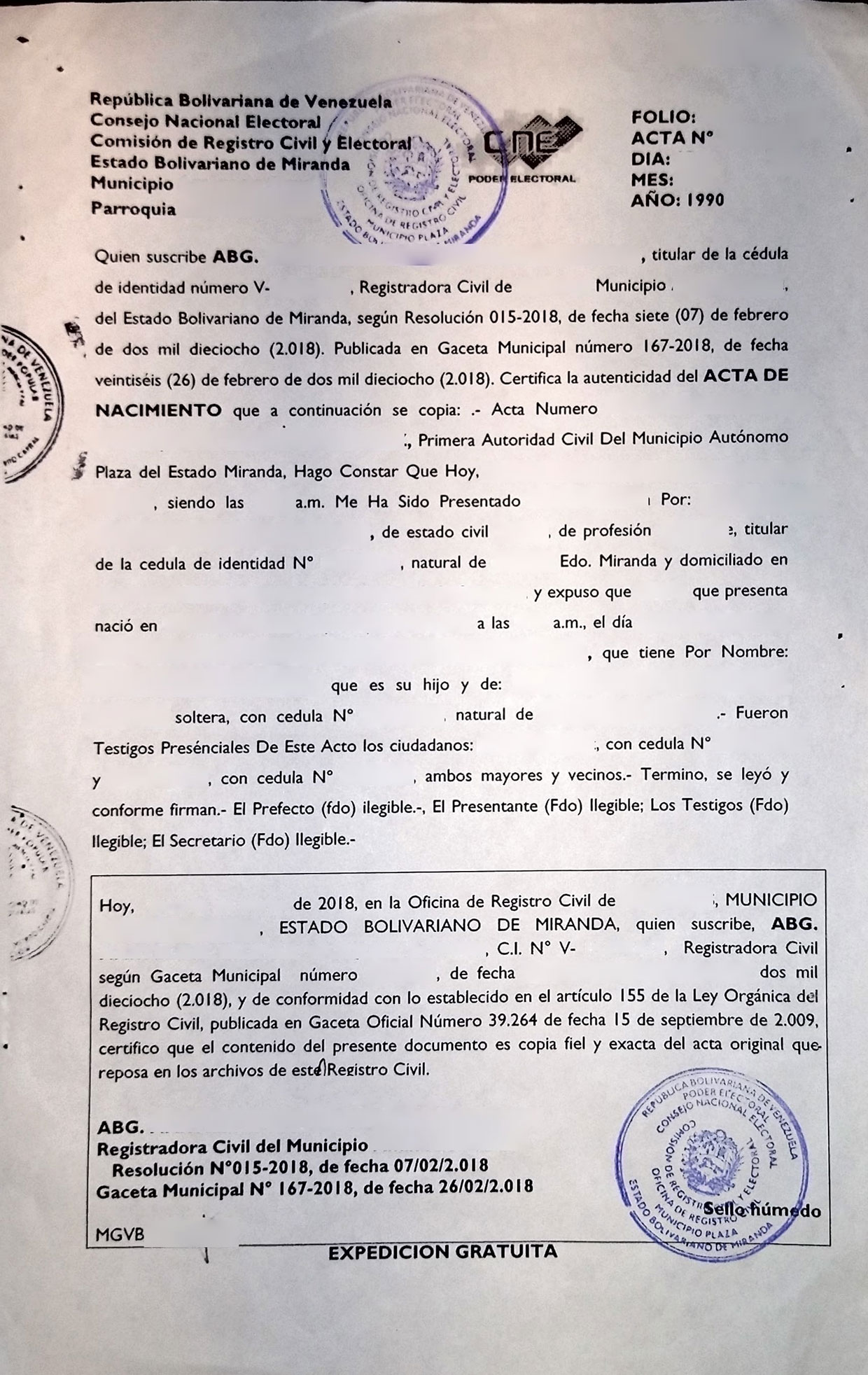 Vorlage für die beglaubigte Übersetzung einer venezolanischen Geburtsurkunde aus Miranda, ausgestellt im Jahr 2018 für eine Geburt aus dem Jahr 1990 von der Comisión de Registro Civil y Electoral