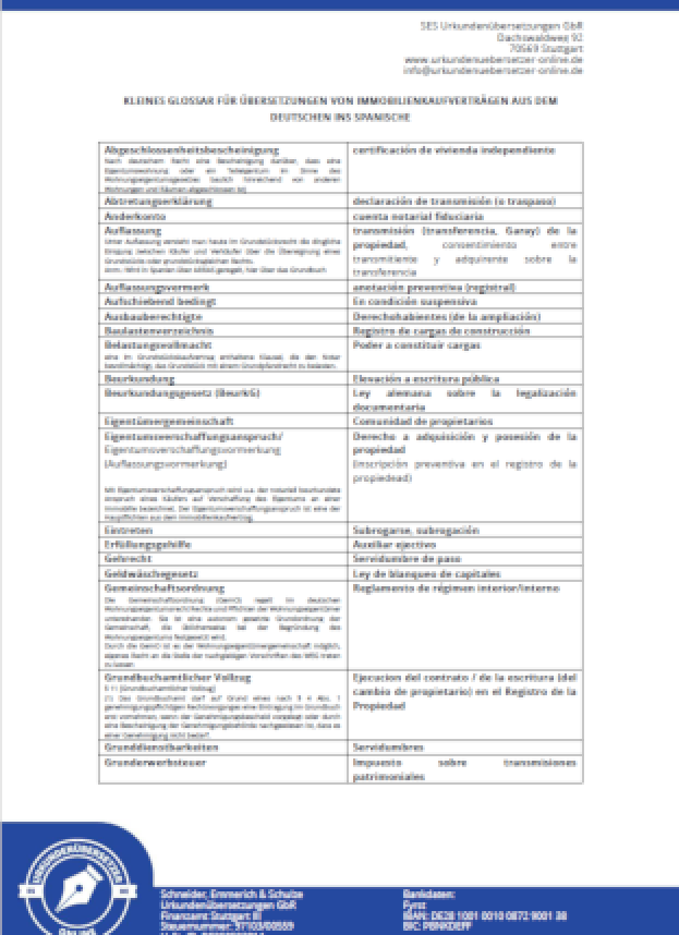 Dreiseitiges Glossar mit knapp 60 Termini und vielen Erläuterungen für die Übersetzung deutscher Immobilienkaufverträge ins Spanische.