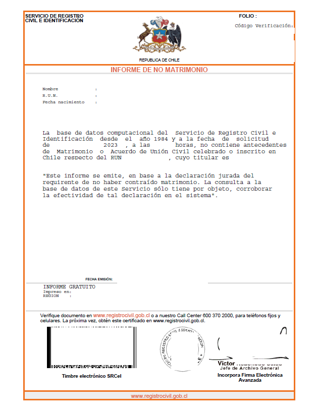 Die Negativbescheinigung zur Eheschließung des Dienstes für Personenstandsregister und Ausweiswesen bescheinigt, dass für die betreffende Person keine Eintragung einer in Chile geschlossenen Ehe vorliegt. Die Vorlage enthält die Übersetzung der Negativbescheinigung inklusive Apostille. In der Regel besteht die Bescheinigung allein aus einer Seite.
