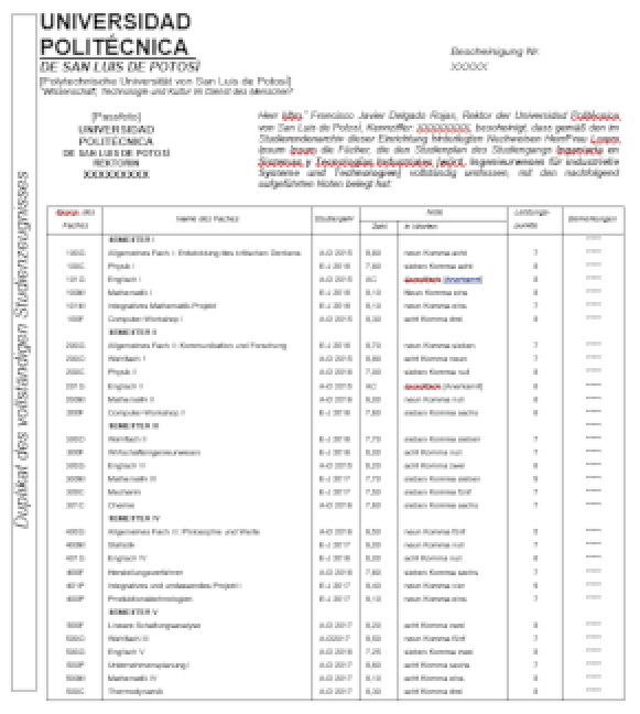 Vorlage für die beglaubigte Übersetzung ES<DE des Notenspiegels für den Studiengang Ingeniería en Sistemas y Tecnologías Industriales an der Universidad Politécnica San Luis Potosí.