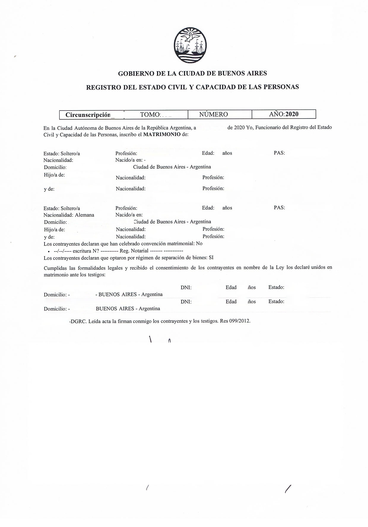 Eheurkunde aus Argentinien aus 2020 des Gobierno de la Ciudad de Buenos Aires, Registro Civil