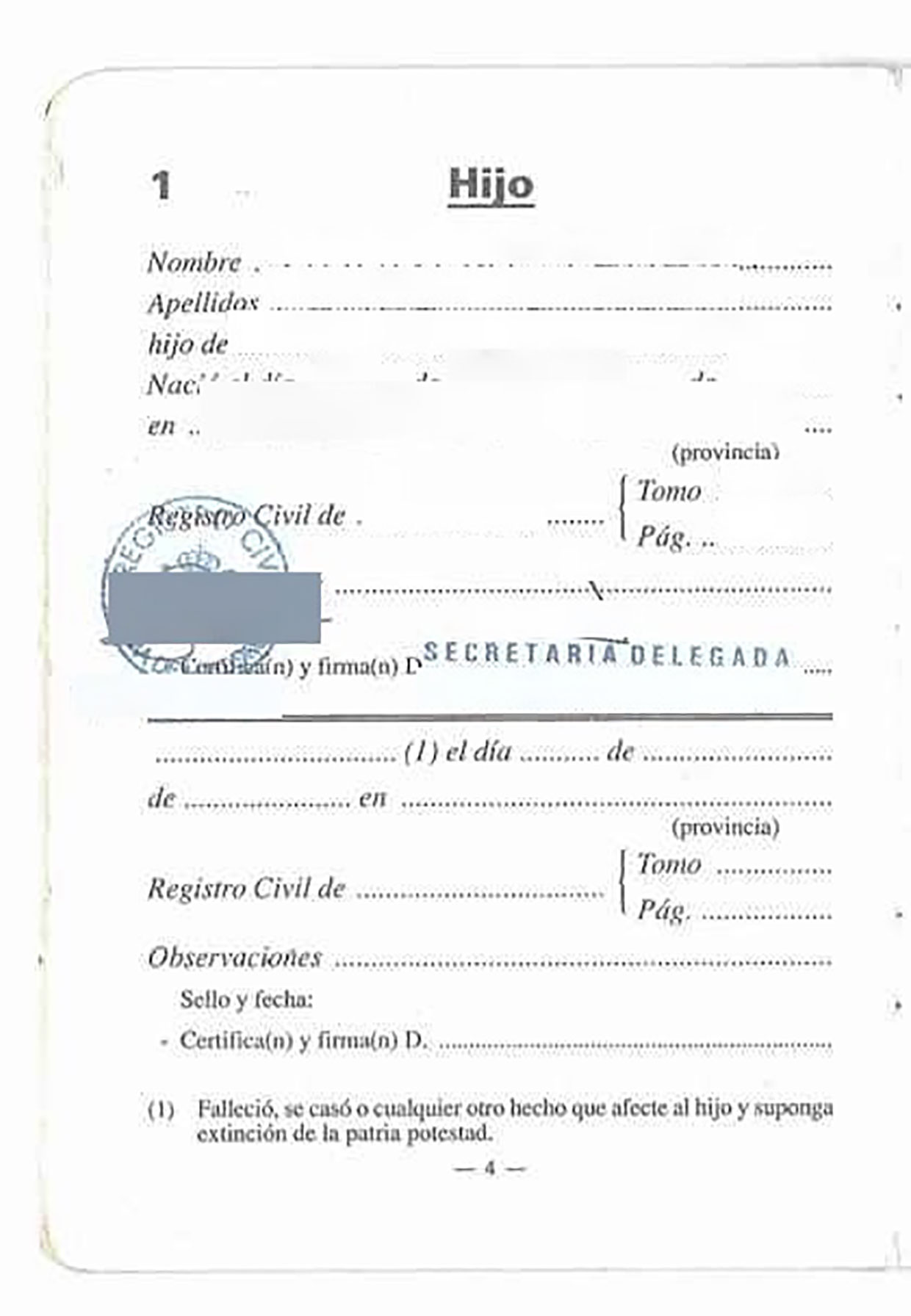 Spanisches Libro de Familia, linker Teil der Doppelseite 4 – 5 zu Punkt 1, Kind