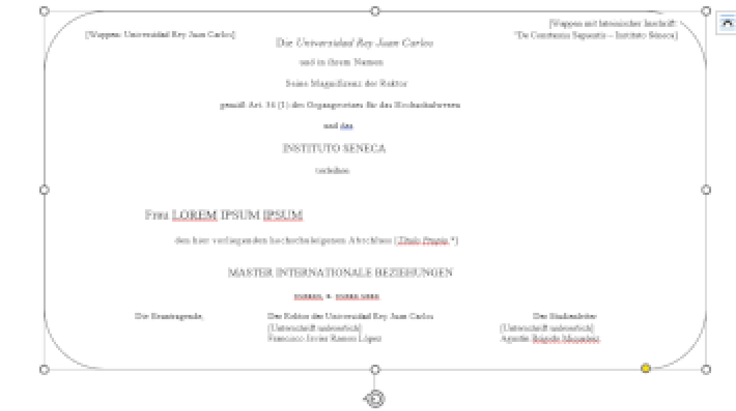 Hier für den Abschluss Relaciones Internacionales, 1. Seite mit Änderungen auch für andere Abschlüsse als Vorlage verwendbar. 2. Seite Auflistung der Fächer; verliehen nach Art. 34.1 Ley Orgánica 6/2001 / Ley Orgánica 4/2007.