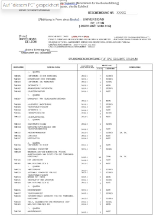Vorlage für die beglaubigte Übersetzung ES<DE des Notenspiegels für den Studiengang Licenciatura en Turismo de Negocios an der Universidad de León, México.