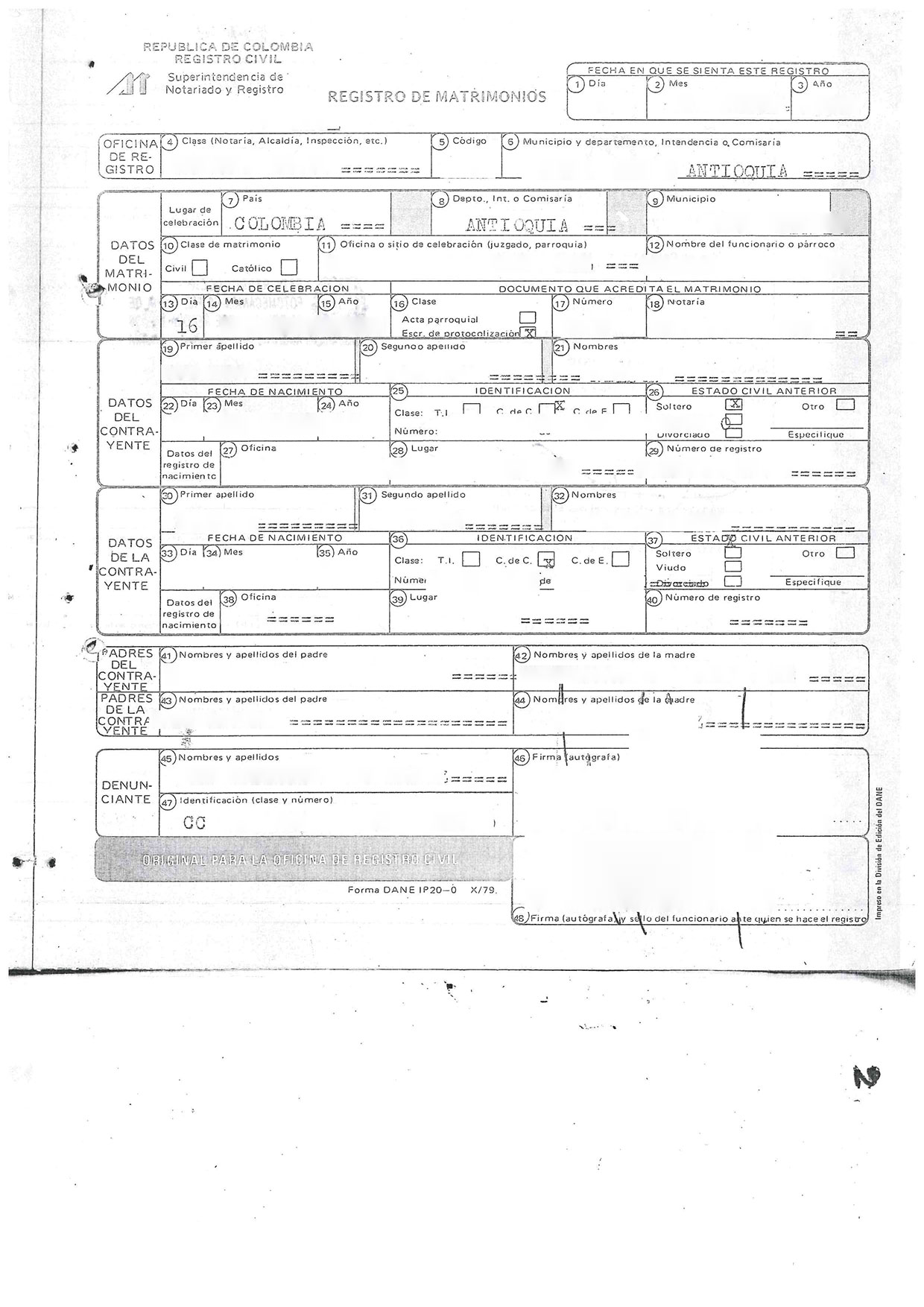 Standesamtliche Eintragung der Ehe Kolumbien (Registro Civil de MatrimonioS), tabellarisch mit Zahlen formatiert