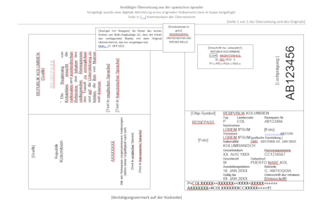 Vorlage für die beglaubigte Übersetzung ES>DE des kolumbianischen Reisepasses inklusive des Deckblattes „Pasaporte“.