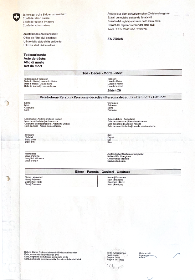Todesurkunde Zürich-Schweiz DE > ES 2025